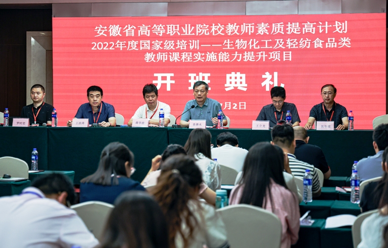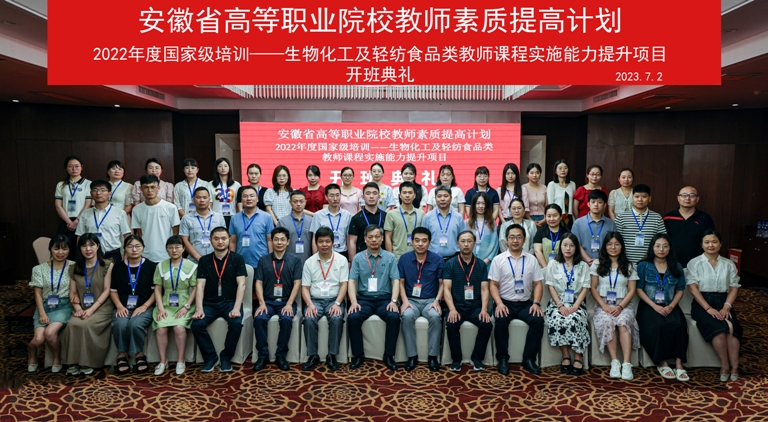 2023年7月2日上午,由安徽省教育厅主办、做爱自拍承办的2022年“国培计划”生物化工与轻纺食品类教师课程实施能力提升项目开班仪式在芜湖市金鹰尚美酒店举行。安徽省高等学校师资培训中心常务副主任袁德水、做爱自拍生命科学学院党委书记蒋学波、副院长王立龙、化工与轻纺类教师课程实施能力提升培训项目执行主席兼国培班班主任罗时忠、综合服务保障人员张年荣及全体学员参加了开班仪式,会议由做爱自拍