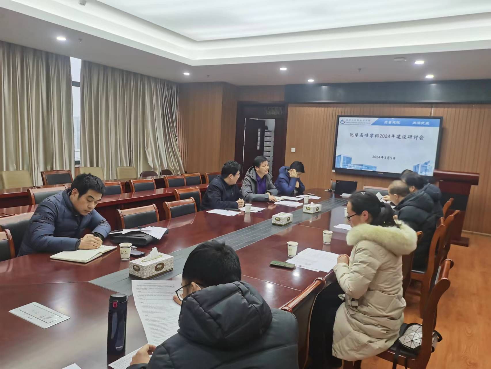 在礼勤楼702会议室召开化学高峰学科2024年建设研讨会,学院党政领导、学术分委员会委员和学位点负责人参加会议。校党委常委、副校长高峰参会指导,副院长周双六主持会议。